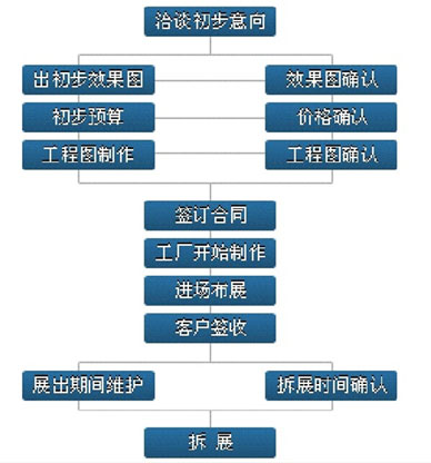 展会现场展示是企业形象与品牌传播的一个重要途径。充分利用展会,将企业形象融入到展台设计中,给每一个展台注入生命力,这样才能使贵公司与竞争者区分开来,在展会宣传中给观众留下深刻的印象;巧妙利用产品与服务卓越独特的个性,使之成为展台造型不可分割的一部分,从而使产品和服务得到有效的推广。卡米会展凭借优秀专业的设计团队、经验丰富的施工队伍、功能齐全的厂房设备和完善高效的管理模式,将竭诚为您量身定做最契合企业特性的展台,并不断地优化我们的服务措施,力争让您的企业形象得以最完美的展示!展台设计施工流程展台富有吸引力,令人赏心悦目,给人以良好的感觉,使人留下深刻的印象。展台设计有很多因素,需要用艺术手法去组合这些因素,使其能产生最佳的视觉效果和良好的心理效应。一个典型的展台设计搭建过程将按照以下步骤进行: ①获取客户信息、与客户交流沟通、取得客户相关资料; ②明确设计大纲、项目组讨论设计方向、设计师实施设计; ③客户在设计图的基础上反馈修改意见。设计师实施最终修改方案; ④确定制作材料和工艺、确定制作价格、签订制作合同; ⑤工厂施工、工程部监督施工进度并向客户做周期性汇报; ⑥现场搭建、工程部负责现场监督协调、客户验收; ⑦开展期间一名专业工人现场服务,撤场; ⑧展后项目负责人提供展会现场照片及项目总结给客户存档